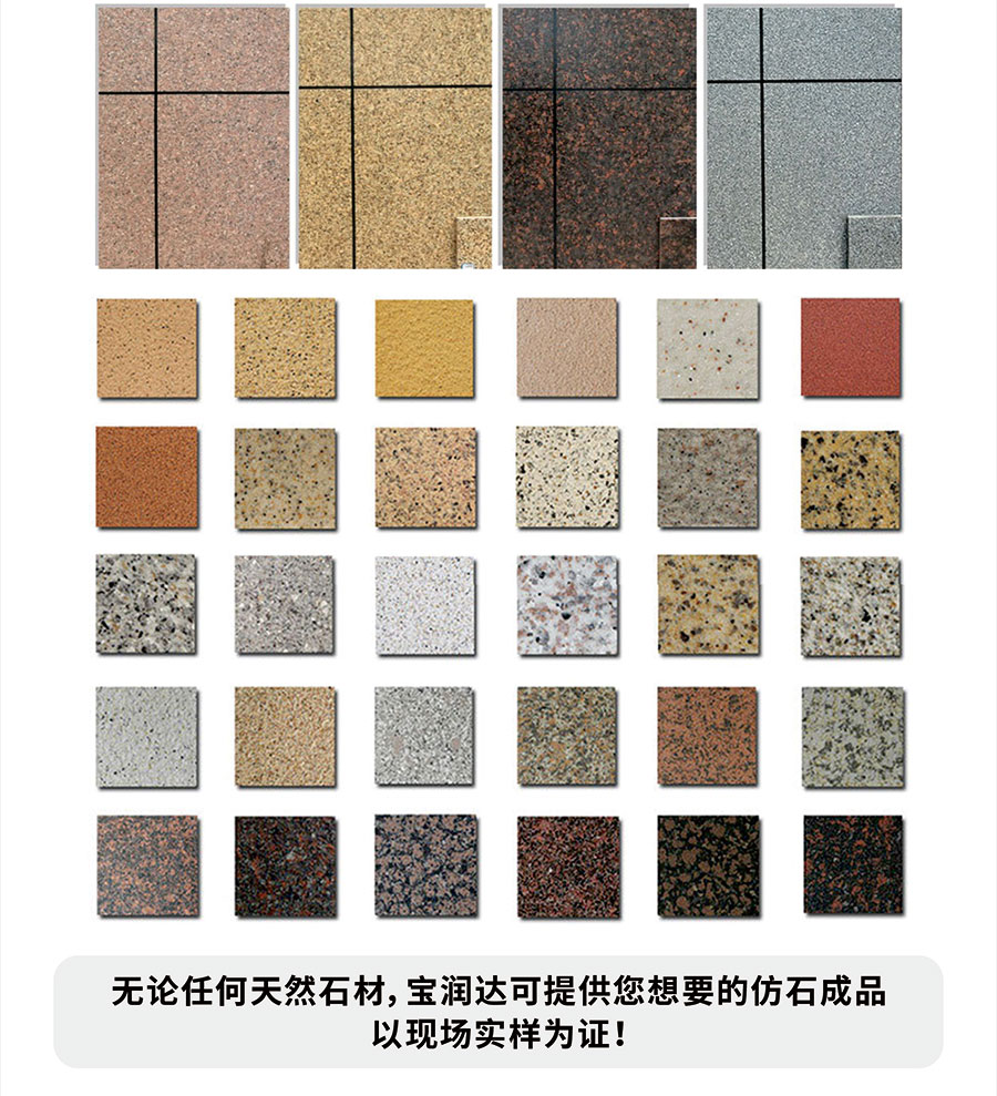 寶潤達(dá)一體板飾面層采用真石漆,多彩漆,水包水,水包砂,乳膠漆,實(shí)色/金屬氟碳超3000種顏色定制,可根據(jù)石材定做樣品